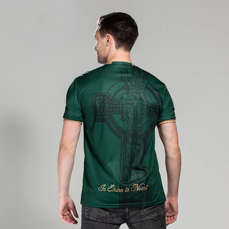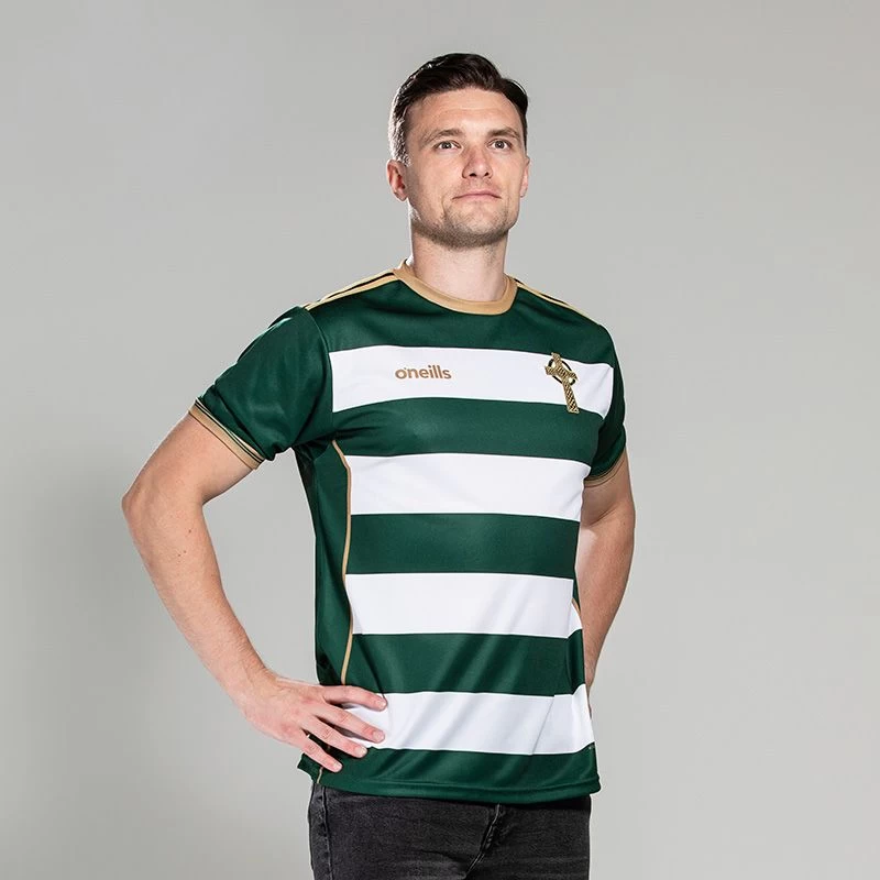 The exclusive O’Neills Celtic Cross Jersey symbolises the patriotism and values of Ireland. Showcasing rich green, white and gold colours. The subtle gold embroidered Celtic Cross sits proudly on the chest for the world to see, with a sophisticated watermark design on the back of the jersey. The shirt is completed with the lettering ‘In Éirinn tá Neart’ – In Ireland There Is Strength. Part of the O’Neills Irish Pride and Heritage Collection, Ireland’s original and oldest sportswear company since 1918.