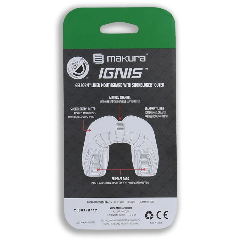 The Makura mouthguard is designed with a Shokbloker outer that ensures absorption of impact, whilst a Gelform liner creates a precise mould of the teeth for a secure wear. The mouthguard has Airthru channels to improve breathing and Slipsafe pads to prevent sliding for superior protection.
