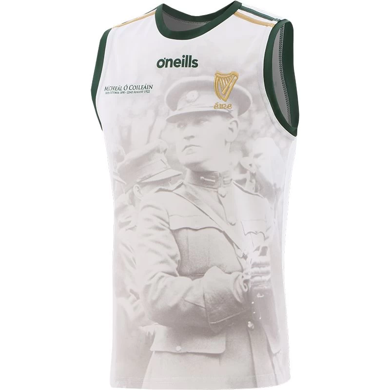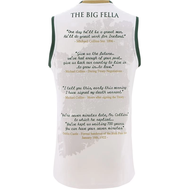The Michael Collins Commemoration Vest features a portrait of Michael Collins on the front with some of the most famous quotes from “The Big Fella” detailed on the back of the jersey. The sleeveless vest pays tribute to the Irish revolutionary, soldier, and politician. Show your Irish pride with the Michael Collins Commemoration vest!