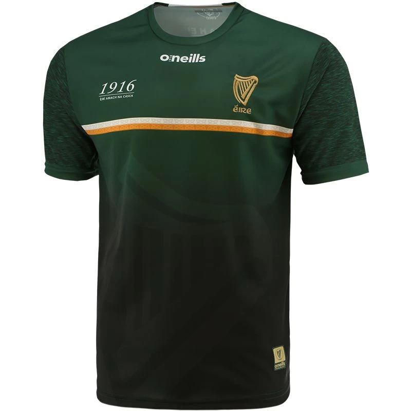 New 1916 commemoration jersey is styled in a brilliant deep green colour with white and gold twin stripe Celtic knot detail across the upper chest, finished with a rich gold embroidered Éire harp crest, Éirà Amach na Cásca text and watermarked harp design. The back of the jersey features the historic Poblacht na hÉireann.